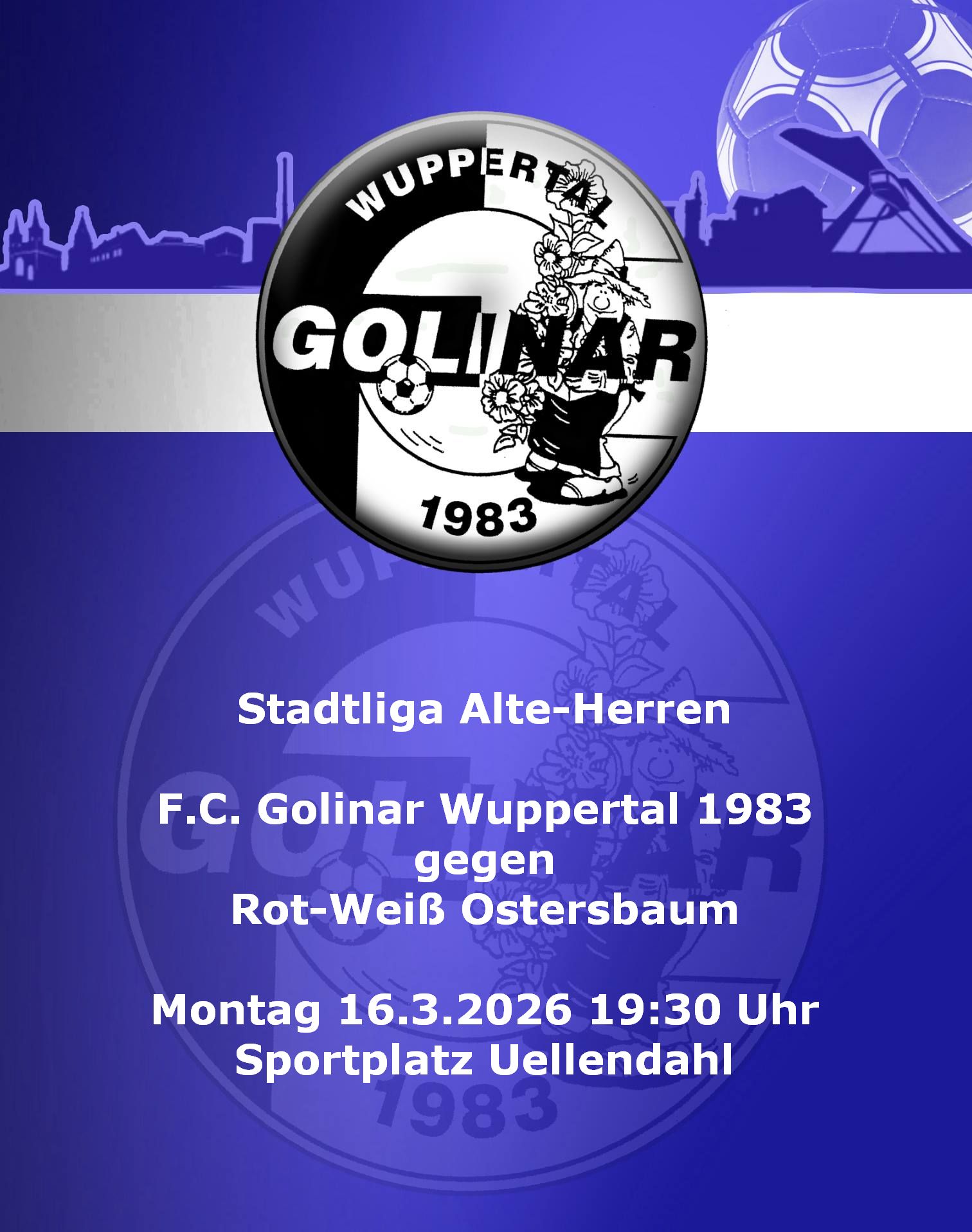 Im nächsten Punktspiel treffen die Alten-Herren des FCG auf Rot-Blau Vohwinkel. Am Montag (2.3.) ist um 20:00 Uhr Anpfiff auf dem Sportplatz Opphof ! ACHTUNG: DOPPELSPIELTAG !!!